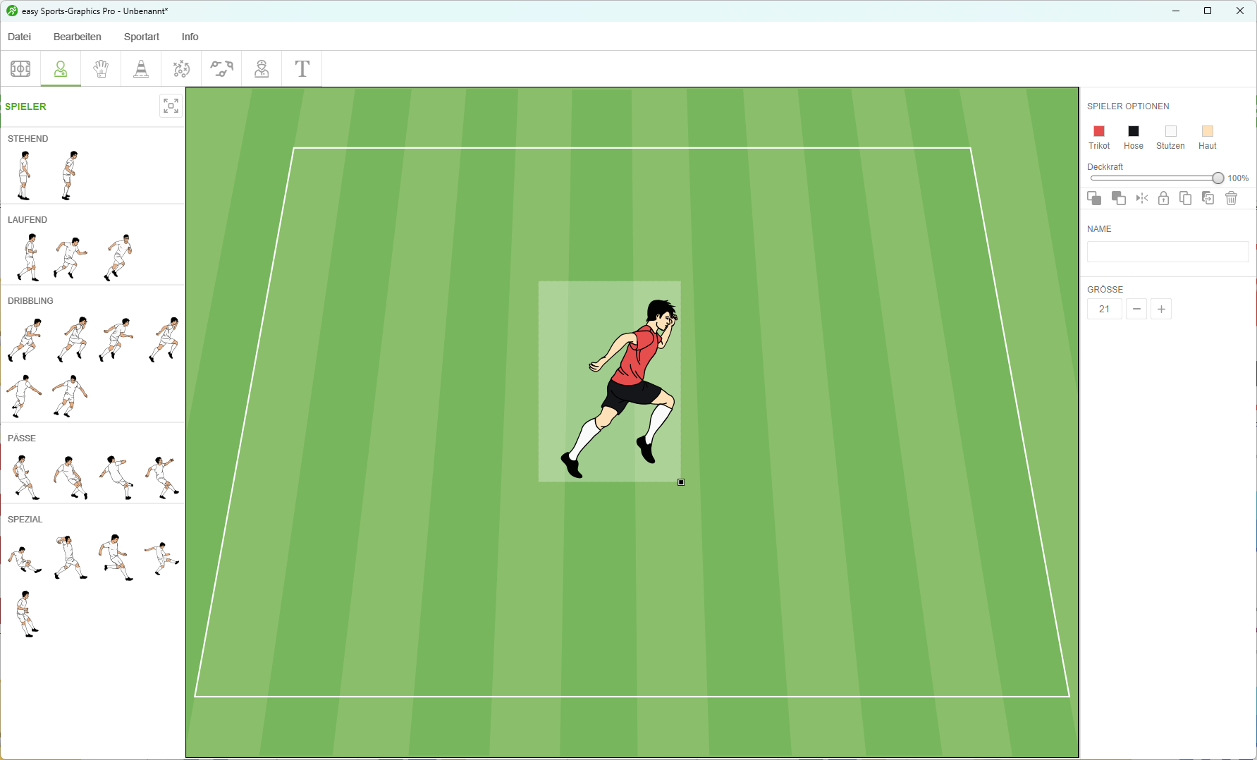 Hier kannst du Trikot-, Stutzen, Schuh- und Hautfarbe ändern, die Größe festlegen und den Spieler benennen. Sobald du Farben eines Spielers geändert hast, werden diese automatisch für alle neuen Spieler, die du auf die Arbeitsoberfläche ziehst übernommen. So musst du nicht jedes Mal die Farben von neuem festlegen.