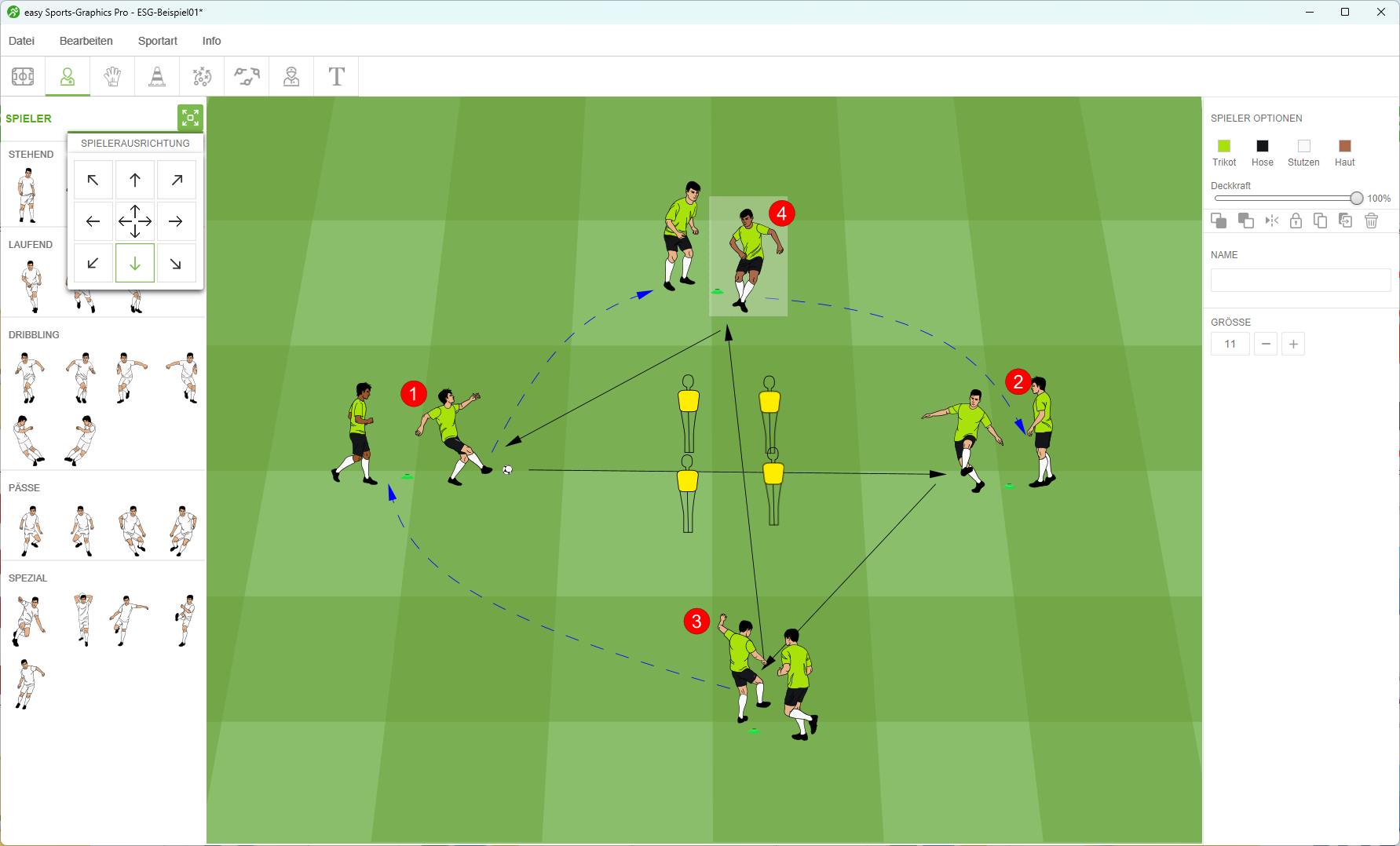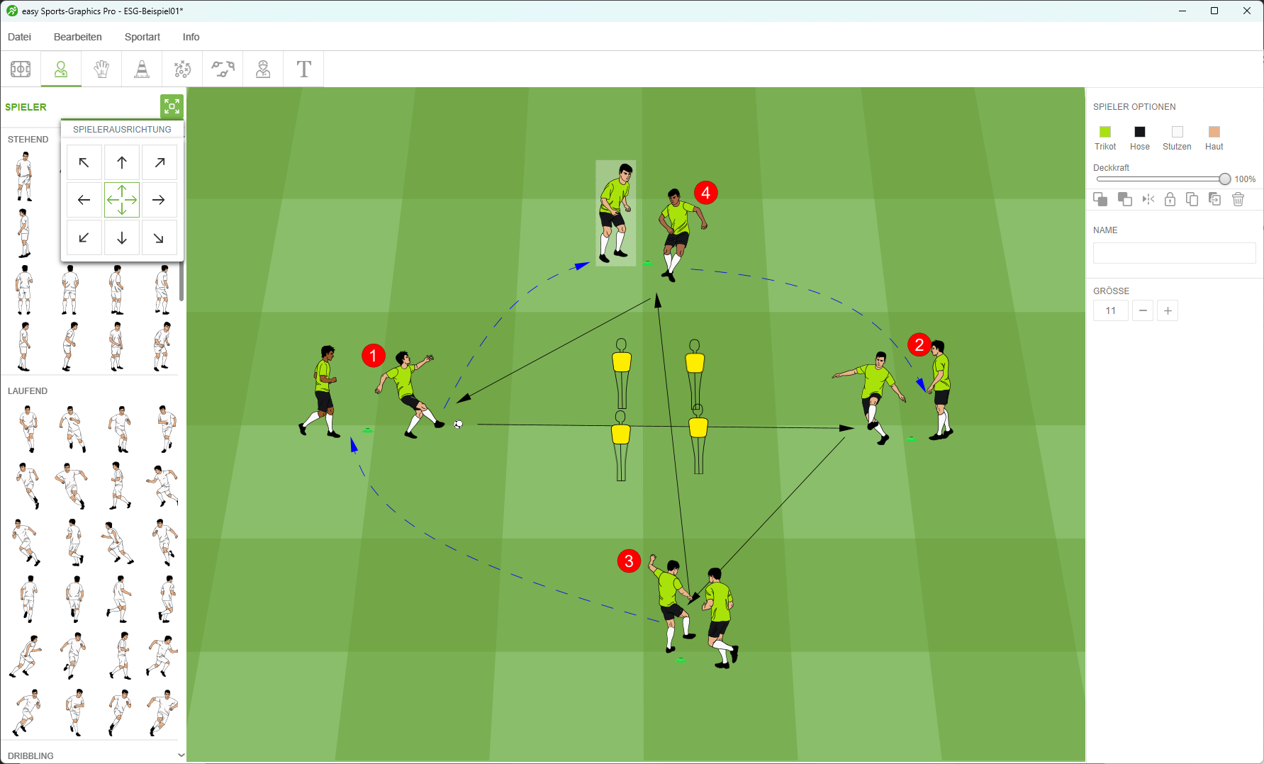 Zusätzlich kann man zur Auswahl der Spieler auch die Spielerausrichtung festlegen. Das ist besonders praktisch, wenn du schnell Figuren finden möchtest, die eine bestimmte Aktion oder Richtung ausführen. Dank der großen Auswahl an Figuren in easy Sports-Graphics PRO findest du so gezielt die passenden Spieler.