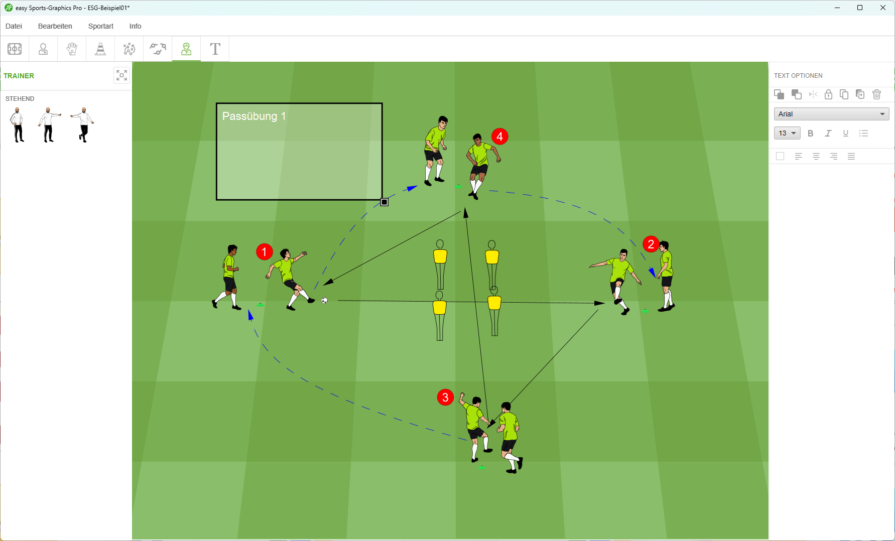 Über den Navigationspunkt „Text“ kannst du per Drag & Drop Text zu deiner Grafik hinzufügen. Das ist besonders nützlich, wenn ein Spieler ein Kommando sagen soll oder der Trainer eine Anweisung gibt. Die Textfunktion funktioniert genauso wie in anderen Programmen: Du fügst den Text zur Grafik hinzu und kannst ihn entsprechend anpassen.