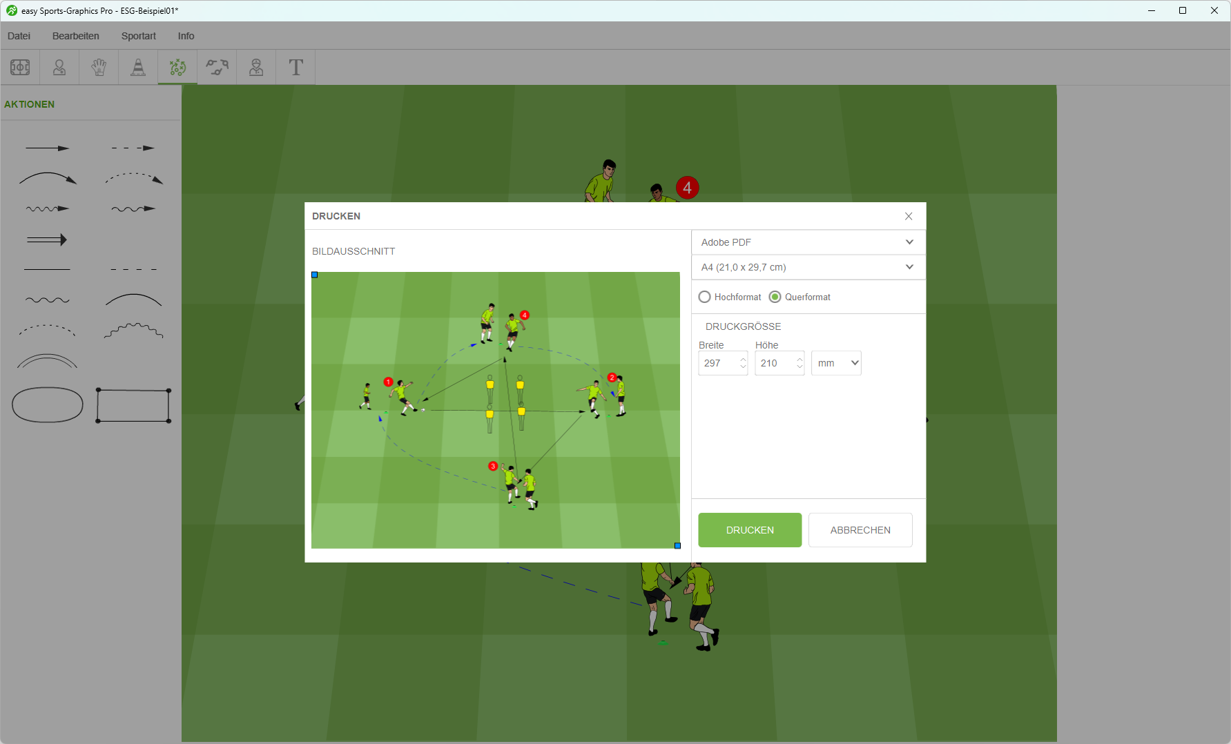 Unter Datei > Drucken lässt sich die Datei direkt als PDF speichern oder ausdrucken. Wie schon beim Exportieren stehen hier verschiedene Optionen zur Verfügung, und es kann der gewünschte Druckbereich ausgewählt werden, sodass nur der relevante Teil der Grafik ausgegeben wird.