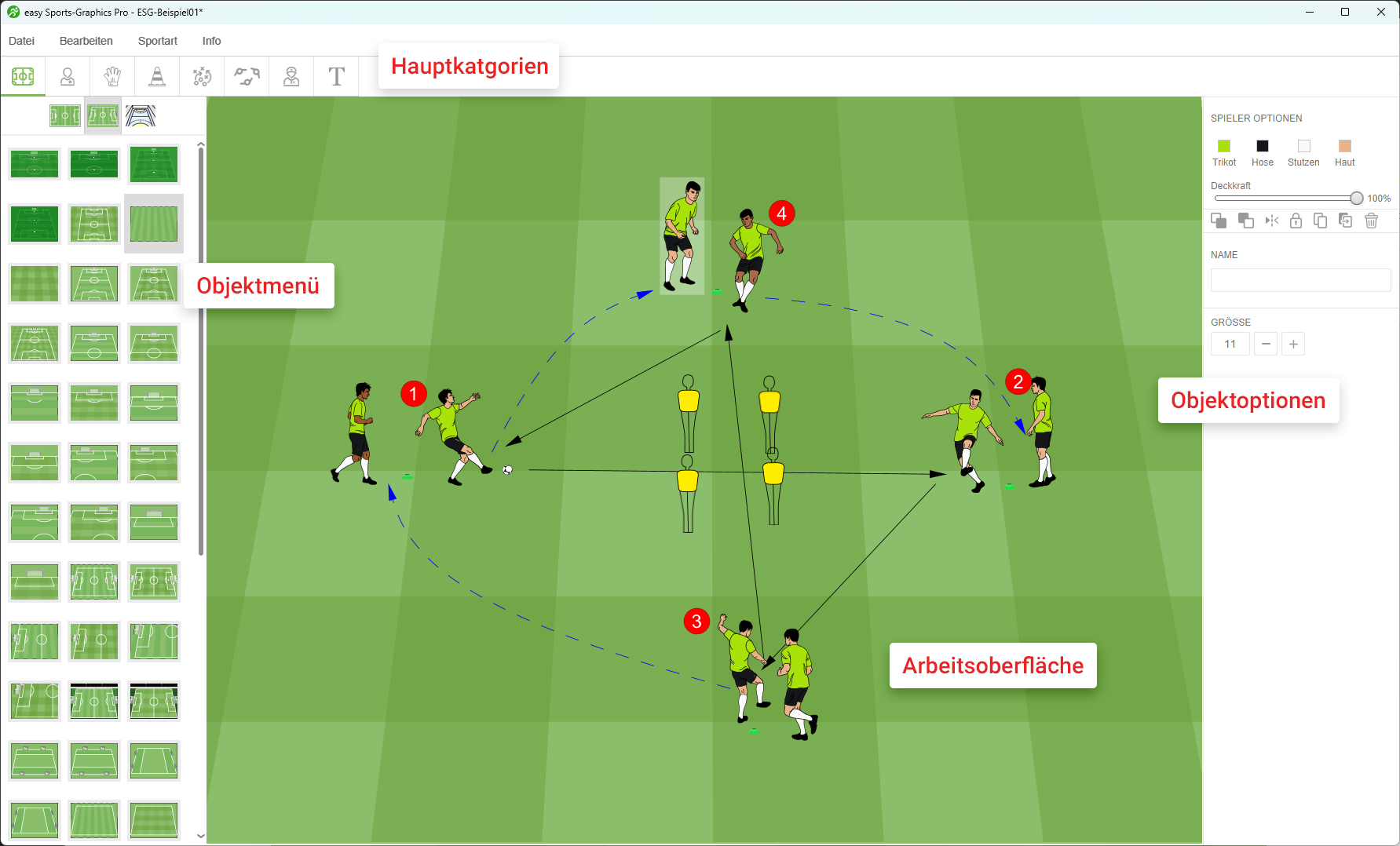 Links befindet sich das Objektmenü, das dir Spielfelder, Spieler und Taktiktools anzeigt. In der Mitte hast du die Arbeitsoberfläche, auf der du die Übung erstellen kannst, und rechts siehst du die Objektoptionen, die erscheinen, wenn du bei einem Objekt mehrere Optionen hast, zum Beispiel um die Trikot-, Hose-, Stutzen- oder Hautfarbe eines Spielers zu ändern.